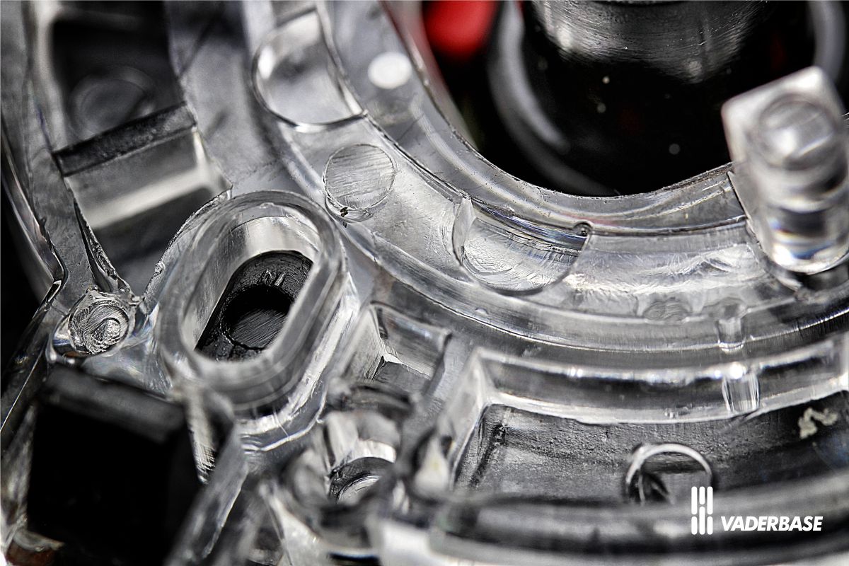 geölt. Kleine Reste übergelaufenen Silikonöls an der Unterseite des