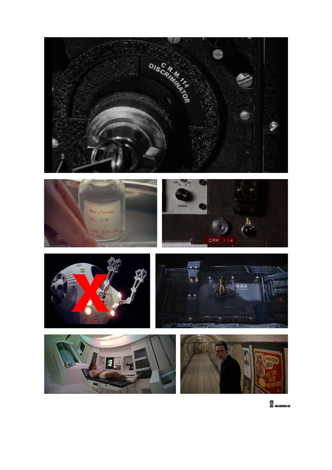 Discovery XD-1 EVA-Pods konnte ich nicht verifizieren oder belegen. Ich nehme daher an, dass CRM 114 nicht auftaucht in 2001: A Space Odyssey. Dafür wird CRM 114 in vielen anderen Filmen als Kubrick-Referenz benutzt: der gigantische