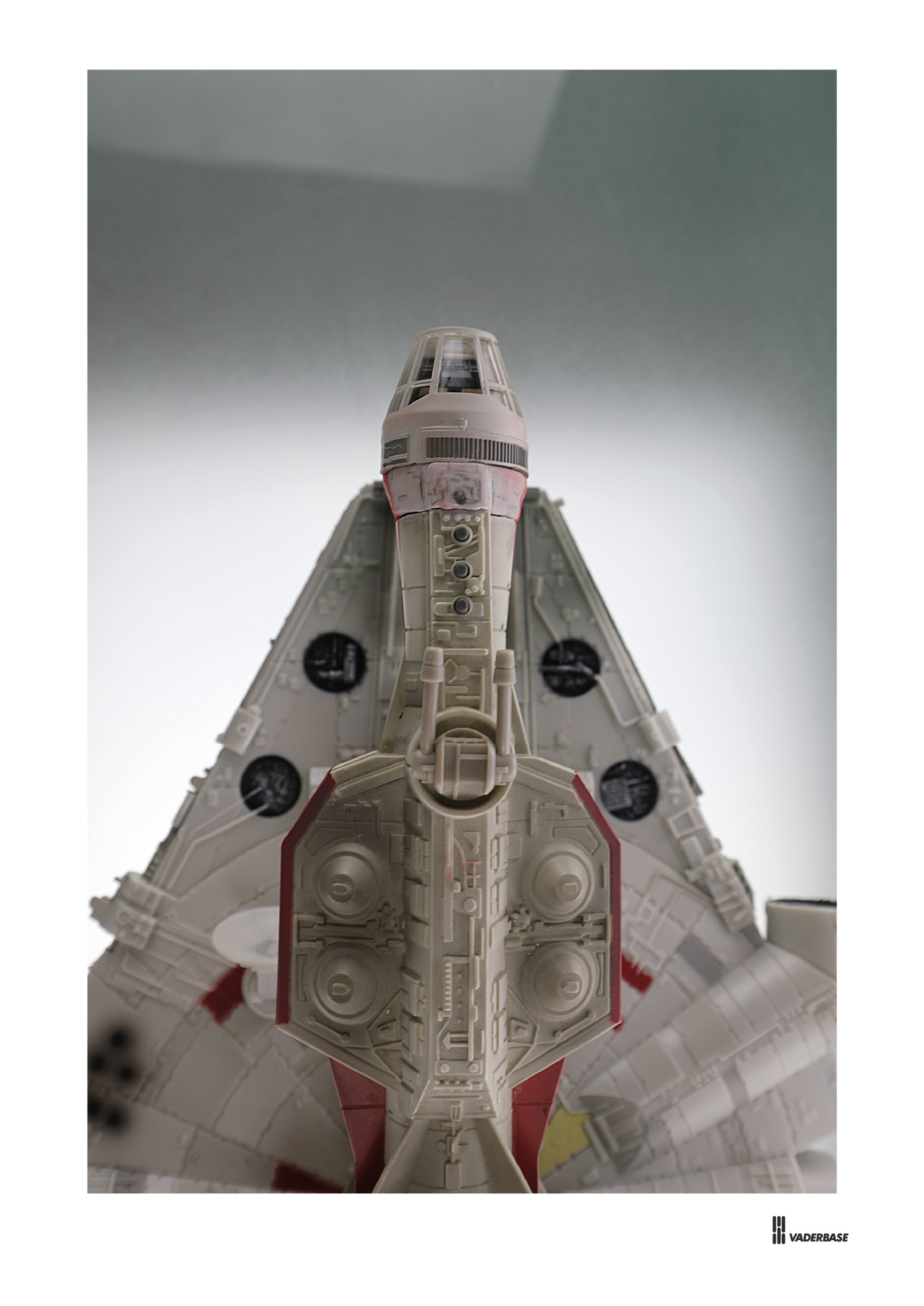 Die beiden Modelle passen maßstäblich perfekt zusammen: der Durchmesser der Pilotenkanzel entspricht mit 38 mm exakt dem Durchmesser der Tantive IV. Offenbar wurden die Maße der Modelle von den Originalmodellen abgenommen. (Ich habe die Kanzel der Tantive IV abgesägt und die Kanzel des Falken aufgesteckt. Da die Tantive IV-Kanzel den Röhrenkörper etwas durchdringt, habe ich die fehlenden 13 mm Zwischenstück selbst angefertigt und leider mit dem roten Buntstift an meinen Fingern alles ein wenig eingefärbt.)